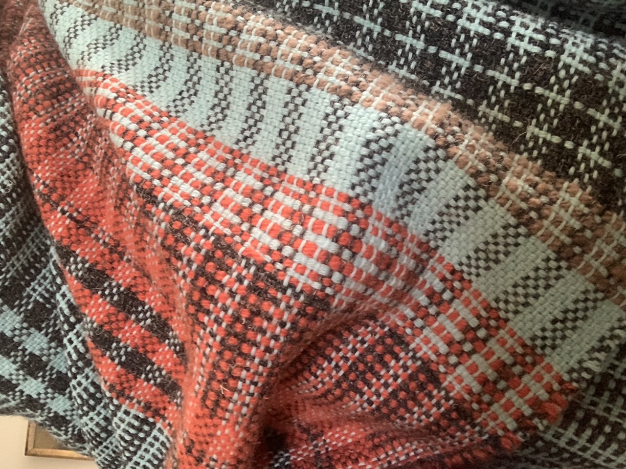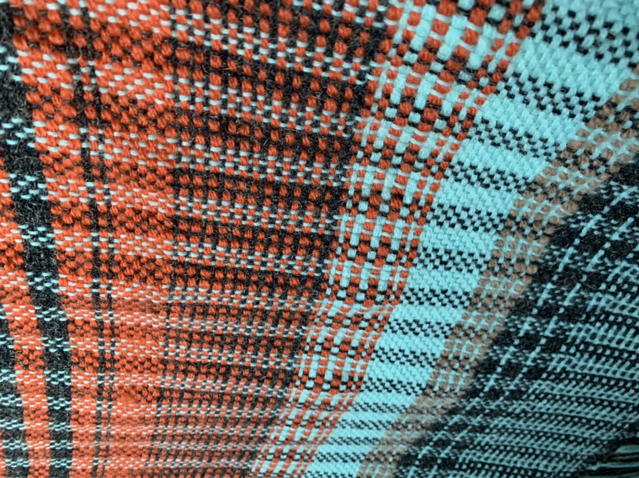 this weave was based on an interesting dark grey yarn made of nettles. we added some brighter colours and geometric patterns and were really pleased with the result. it has something reminiscent of the London tube seat covers about it.