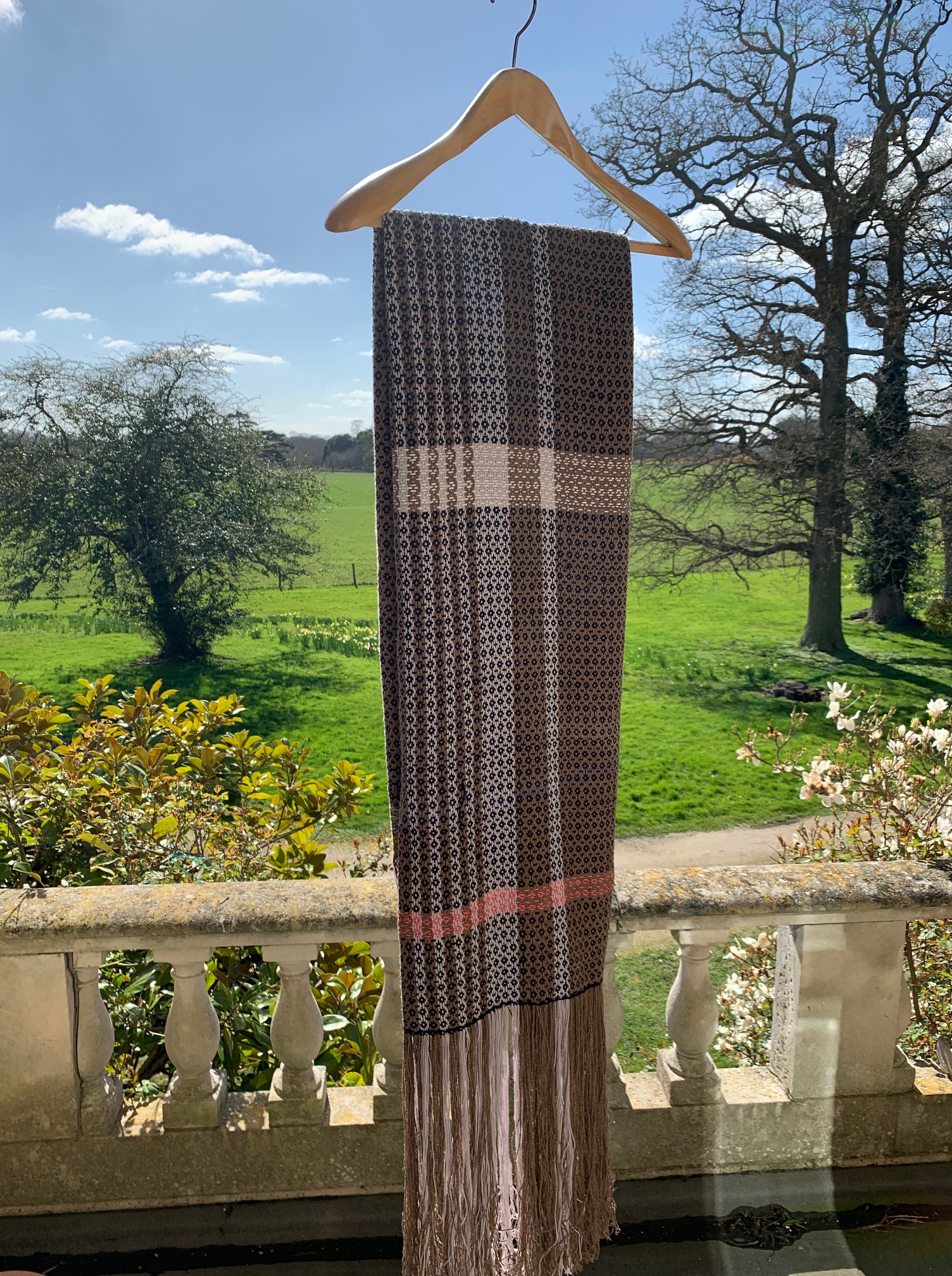 This is a Birdseye Twill which I wove in silk/merino with linen/cotton on a rigid heddle loom with 3 heddles.. Photographed before the ends were knotted and tied in.